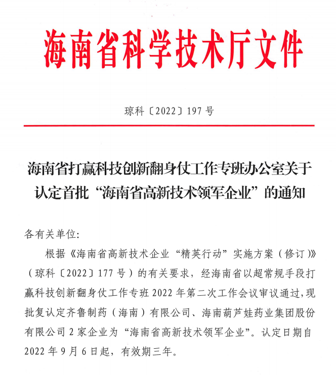 近日,海南省科学技术厅发布的《海南省打赢科技创新翻身仗工作专班办公室关于认定首批“海南省高新技术领军企业”的通知》中显示,批复认定海南z6mg·人生就是博药业集团股份有限公司等2家企业为“海南省高新技术领军企业”。认定日期自2022年9月6日起,有效期三年。