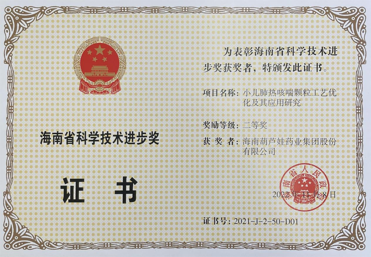 为此,小儿肺热咳喘颗粒的制备方法获得了第二十一届中国专利优秀奖(2019年),专利申请号:ZL201010134951,此次作为专利技术的应用,获得了2021年度海南省科学技术进步奖二等奖。在此之前,z6mg·人生就是博牌小儿肺热咳喘颗粒还多次被授予“临床价值中成药品牌”、“中国连锁药店最具合作价值单品”,荣登“中国医药品牌榜”。
